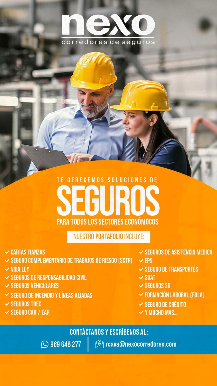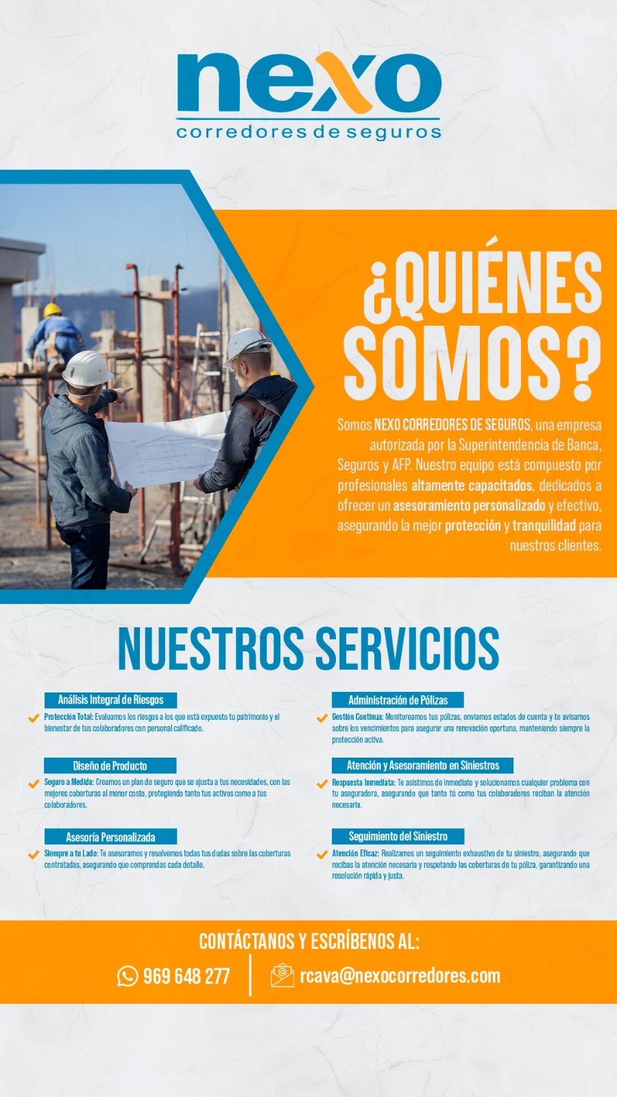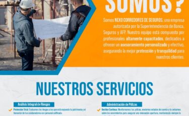 Nexo Corredores de Seguros E.I.R.L., fundada en 2016 y autorizada por la SBS, es especializada en ofrecer soluciones de seguros integrales para todos los sectores económicos. Contamos con un grupo de profesionales con amplia experiencia, dedicados a proporcionar cobertura personalizada que asegura la operatividad y sostenibilidad de las operaciones de nuestros clientes, garantizando un servicio de alta calidad adaptado a las necesidades específicas de cada industria.