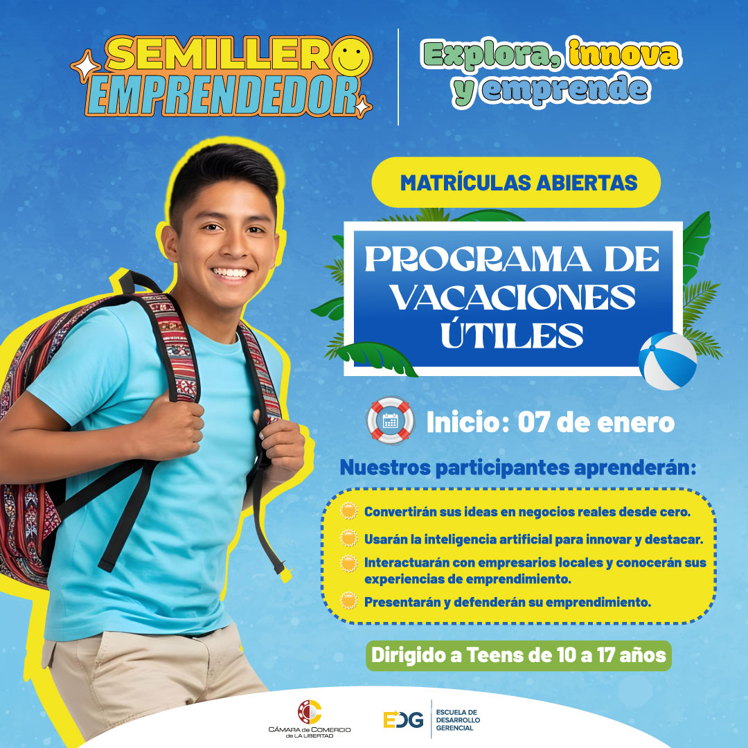 La Cámara de Comercio de La Libertad ha diseñado esta innovadora propuesta, que cada año logra posicionar ideas transformadoras. Nuestro objetivo es ofrecer una formación integral que prepare a los jóvenes para innovar, crear y adaptarse a un entorno en constante cambio. Participar en este programa hará que sus vacaciones sean no solo divertidas, sino también educativas y enriquecedoras para su desarrollo personal y profesional.